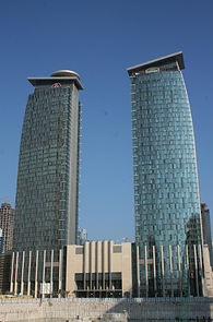 On the left are the 50-storey Marriott Renaissance and Courtyard in a combined 7-storey podium. At the right are the Towers Merweb, Rotana (left) and Shangri-la (right).